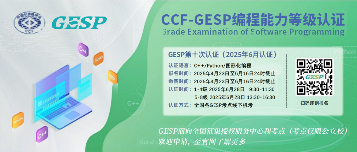 CCF GESP第十次认证时间为2025年6月28日,1-4级认证时间为上午9:30-11:30,5-8级认证时间为下午13:30-16:30。4月23日17:00开启第十次认证报名通道,考生可登录GESP官网进行报名。GESP认证方式为全国各GESP考点上机考试,认证语言包括:C++、Python和图形化编程三种语言,其中C++和Python编程分为1-8级,图形化编程分为1-4级。