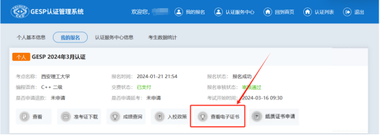 自2025年4月16日起,考生可登录GESP官网,查看电子证书。盖章版电子证书需登录考生报名系统,在“我的报名”中查看及下载。