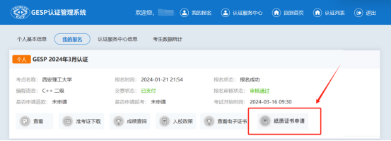 申请方式:打开GESP官网(https://gesp.ccf.org.cn/)→ 登录 → 点击“我的报名” → 点击“纸质证书申请”→ 填写邮寄信息支付邮寄费用。