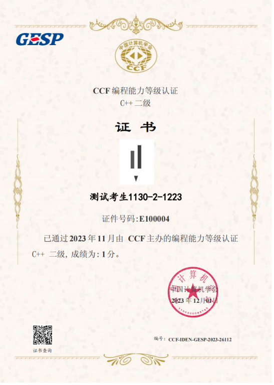 CCF GESP第九次认证已于2025年3月22日圆满结束。为积极响应全球环保号召,践行绿色办公理念,自2024年起,已全面采用电子证书取代纸质证书(官网下载的电子版的GESP官方纸质证书打印效果和纸质证书一样)。若考生仍需纸质证书,可在2025年4月16日-4月27日期间,通过考生报名系统在线申请纸质证书,届时只需承担相应的邮寄费用即可。